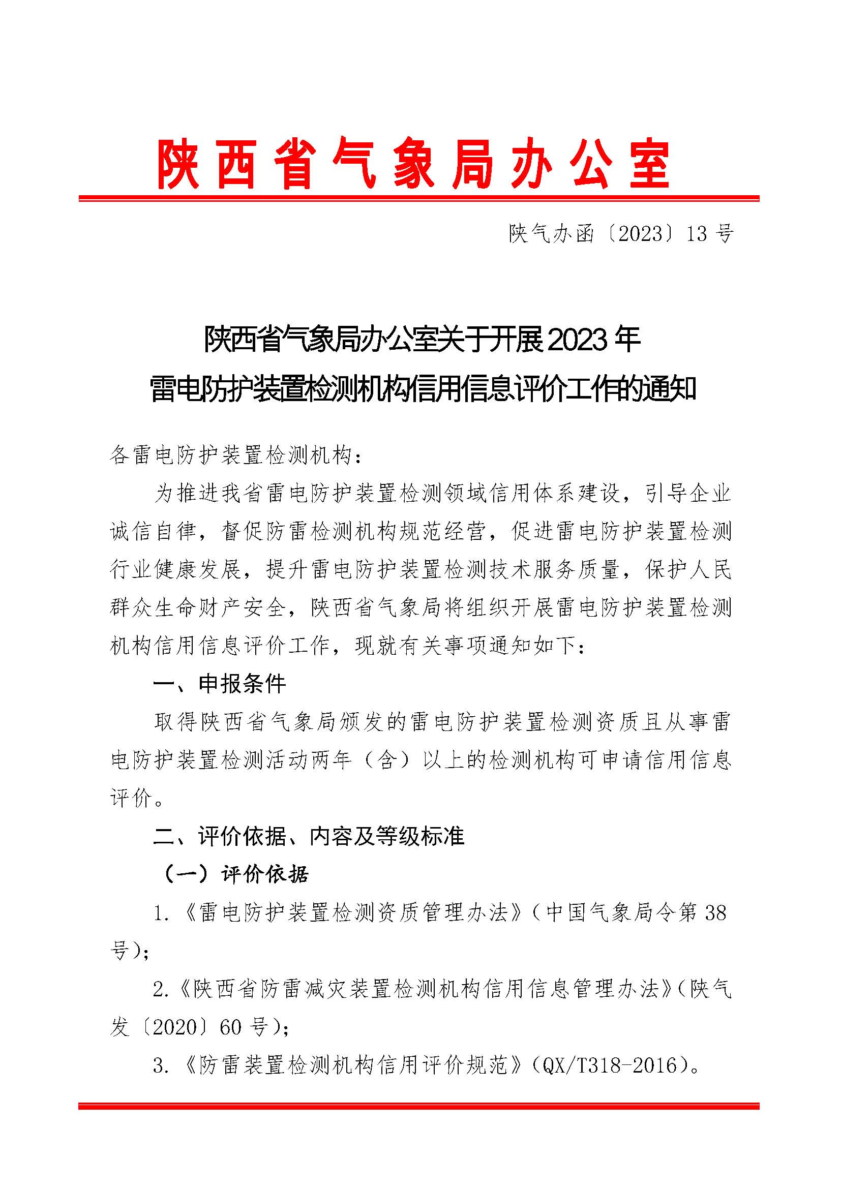 陜西省氣象局辦公室關于開展2023年雷電防護裝置檢測機構信用信息評價工作的通知